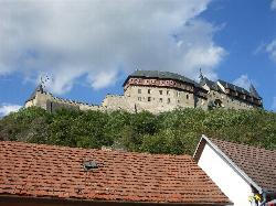 Zurück in Karlštejn ging unser Blick vom Hotel (rechts) nochmal hoch zur Burg Karlštejn (links).