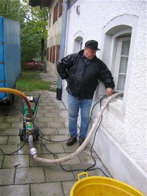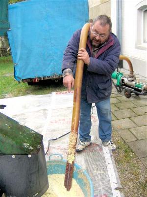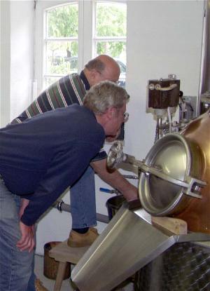 Maische über den Ablauf in die Grube befördert und die Brennblase